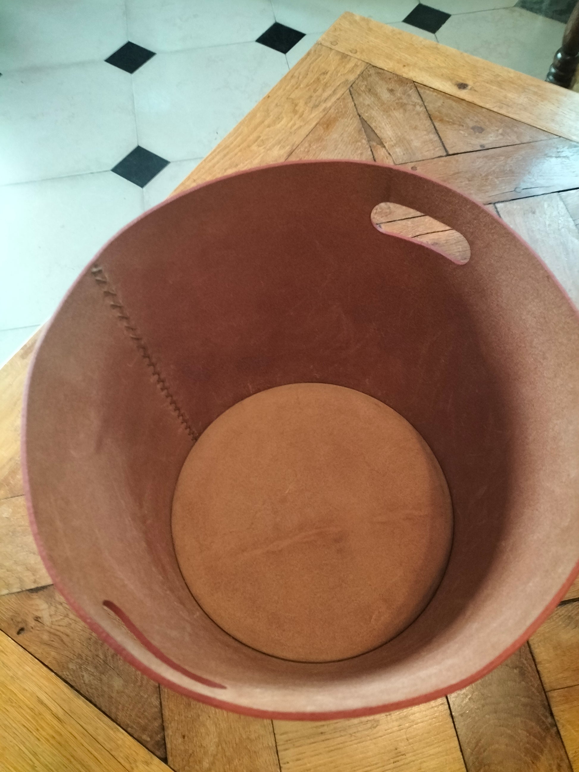 Summum de l'élégance et du raffinement, cette corbeille à papier est 100% en cuir pleine fleur, tannage végétal et cousu à la main bord à bord.
